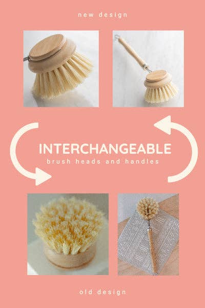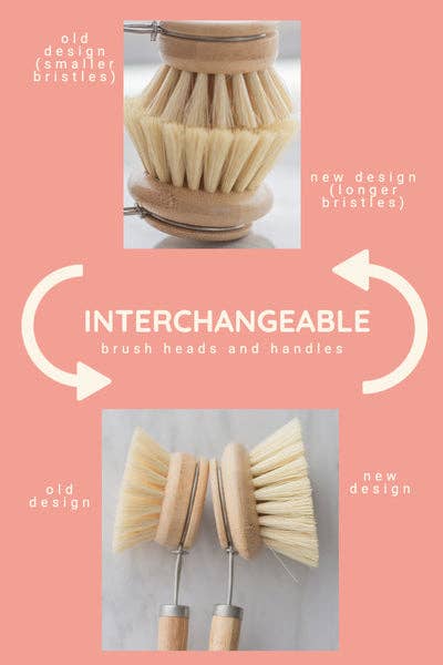 This removable-head dish brush has a Moso Bamboo handle and brush head, with stiff agave fiber (vegan) plant bristles. It is held together with silver metal wire, and includes a small wire loop at the end for hanging dry.