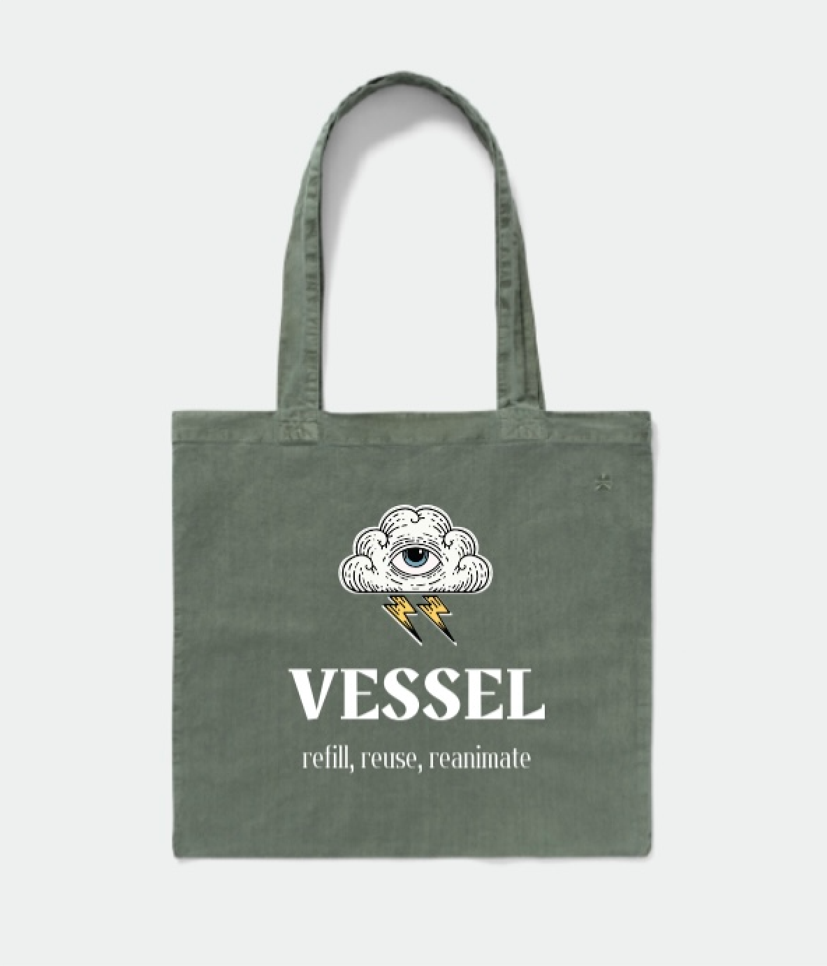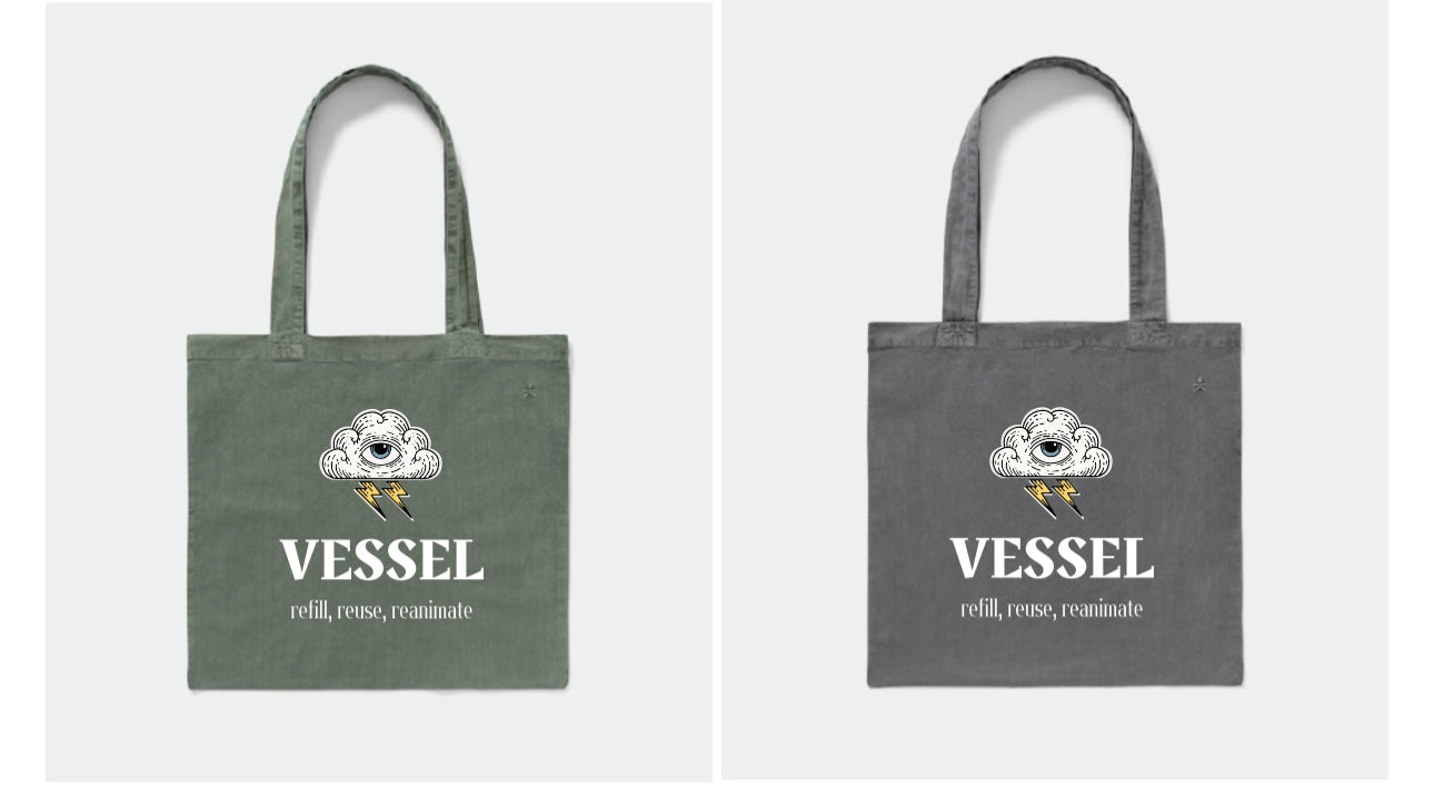 Sustainably made & fair trade certified 100% cotton tote bag. Available in Slate Gray or Olive Green, bring this chic and useful bag into Vessel for 15% off your first order during our grand opening month! ✨ (Available in-store only.)