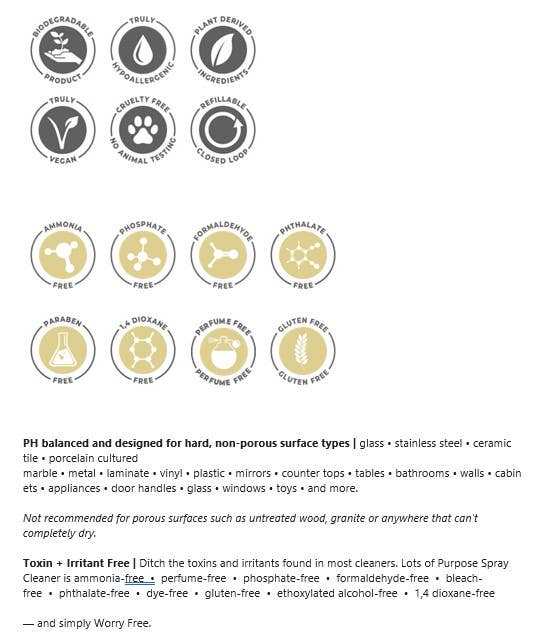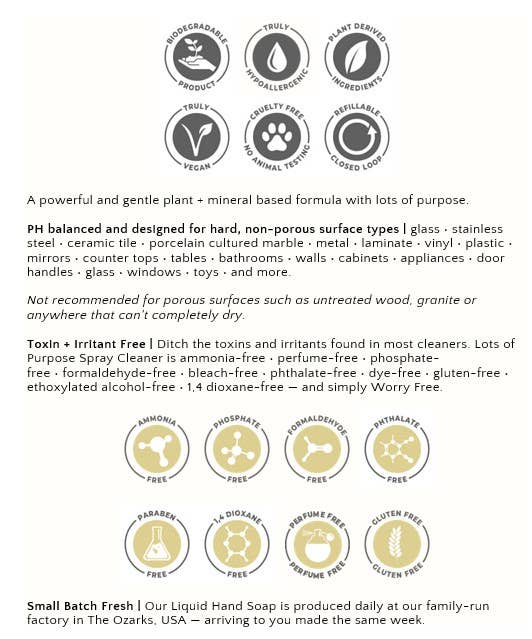 Our multipurpose spray cleaner is pH neutral and cleans glass, walls, cabinets, appliances, door handles, ceramic, mirrors, kid's rooms, bathroom areas, end tables, windshields, tile, linoleum, coffee tables, windows, toys, cultured marble, countertops, window screens, desks, kitchen appliances just to name a few.