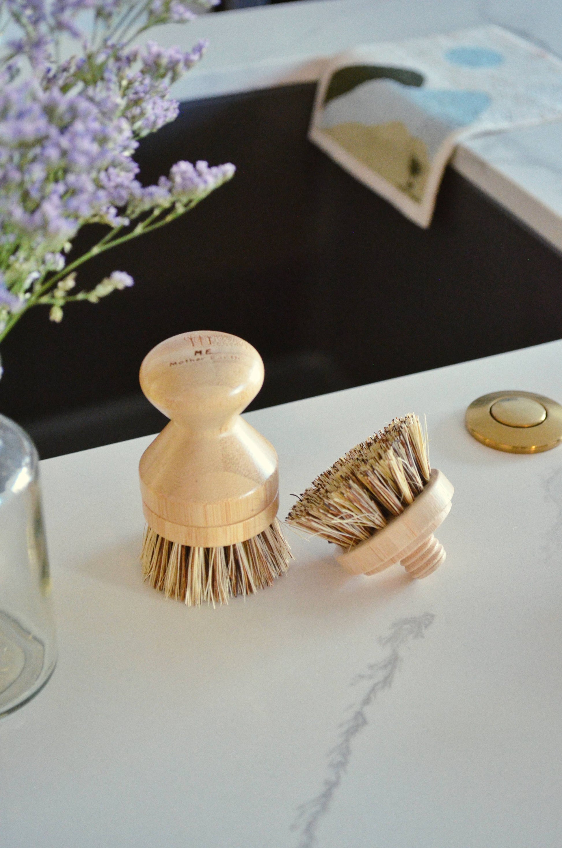 Mother Earth Approved: Pot scrub brush refill is bamboo with palm + sisal bristles. Multipurpose hand brush refill head is bamboo with sisal bristles.